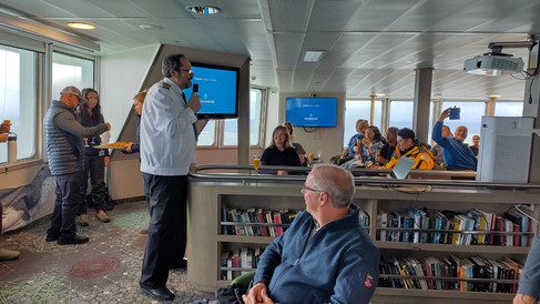 Um 19 Uhr gibt es Sektempfang in der Lounge und Vorstellung der Crew – der Kapitän Martin aus Schweden, die Schiffsärztin Aniska aus den Niederlanden, die uns über Seekrankheit erzählt, der Expeditionsleiter Adam aus Großbritannien und seine 10 top ausgebildeten Guides aus Polen, Deutschland, den Niederlanden, der USA, Großbritannien, Argentinien und Neuseeland, die mit uns die Aktivitäten an Land unternehmen werden. Die Stimmung ist großartig … ein kunterbuntes, fröhliches, internationales Durcheinander. Man stellt sich da vor, wird dort um seine Nationalität gefragt, stellt selber neugierig unzählige Fragen ... und hat das Gefühl, „die sind alle so wie ich“. Als würden sie meine Gedanken lesen können. 108 Menschen zwischen geschätzt 25 und 80 Jahren aus 23 Ländern, versammelt auf einem Boot, alle mit dem gleichen großen Ziel: Antarktis!