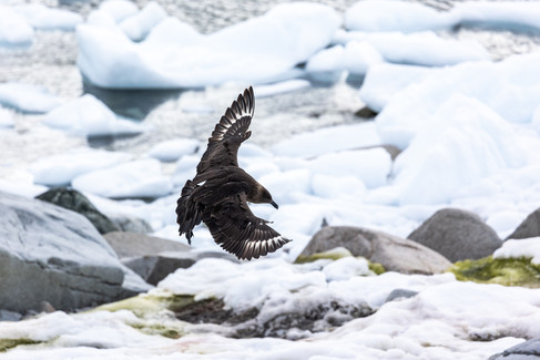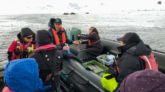 Eine Zodiac-Cruise bei Foyn Harbour steht am Plan. Dieses Mal mit Steffi, unserer Guide(in) aus Deutschland bzw. Wien. Das Wetter ist vielversprechend, immer wieder schaut die Sonne durch die Wolkendecke. Die Landschaft ist wesentlich sanfter als die letzten Tage. Berge sind einer Hügellandschaft gewichen. Es dauert nicht lang und wir entdecken eine große Gruppe von Pelzrobben am felsigen Ufer abhängen. Wir beobachten sie eine Weile, sie kümmern sich nicht sonderlich um uns. Einige Vögel tummeln sich in ihrer Nähe, unter anderem Kormorane und ein Albatros. Vor allem Albatrosse haben wir bisher nur sehr selten zu Gesicht bekommen. Es fällt uns wieder auf, wie wunderbar klar das Wasser ist. Die nach wie vor zahlreichen Eisberge leuchten im schönsten Türkis unter der Oberfläche. Steffi bringt uns in eine Bucht, in der ein Schiffswrack, die "Governoren" liegt. Auf dem über hundert Jahre alten Walfänger-Schiff wurde früher Walöl produziert – bis zu dem schicksalshaften Tag im Jahr 1915, an dem ein Umtrunk an Bord zu sehr ausuferte und das Schiff in Flammen aufging. Bei einem mit Walöl voll beladenem Schiff eher nicht so günstig. Die 85 Mann Besatzung konnte sich retten, musste sich aber wohl einen neuen Job suchen. Hinter dem Wrack hat ein, wie wir vermuten, privates Segelboot angelegt. Steffi schüttelt nur den Kopf … direkt über dem Schiff ragt ein Gletscherüberhang in die Höhe. Falls das Eis abbricht, hätte das verheerende Folgen für den Segler. Die goldene Regel: die doppelte Gletscherhöhe Abstand halten, um bei einem eventuellen Abbruch aus der Gefahrenzone zu sein. Wir fahren mit dem Zodiac weiter raus aus der Bucht. Plötzlich kommt ein Funkspruch: "Whales!" Oh yesss! Bald treffen wir auf die anderen Zodiacs, die sich bereits in der Nähe von zwei Buckelwalen verteilt haben. Ach, wie schön! Die beiden Wale sind sehr entspannt, liegen lange einfach im Wasser, drehen sich ab und zu oder schwimmen ein Stück, blasen dazwischen ab und zu Fontänen aus zur Atmung. Wir haben richtig viel Zeit, um ihre Anwesenheit zu genießen. Es ist komplett still um uns herum, nur der Wind, das Meer und die Wale sind zu hören. Auf einmal dreht sich ein Wal auf den Rücken, und, als würde er sich nach einem ausgiebigen Nickerchen dehnen, streckt er zuerst die eine Brustflosse in die Höhe – sie wirkt richtig fragil in der Luft – und lässt sie zurück ins Wasser fallen. Bam – eine irrsinnige Wucht, als die Flosse auf die Wasseroberfläche platscht. Dann die andere Flosse, wiederholt dies ein paar mal – Bam, Bam – dreht sich wieder um und taucht unter. Wow! Was für ein Erlebnis! Wir halten den Atem an, das waren unglaublich intensive Momente. Vor allem weil der Wal so nahe war – ich habe die beiden Flossen mit meinem 200er-Objektiv nicht vollständig aufs Bild gebracht! Kurz darauf kommt ein Funkspruch rein und wir hören irgendetwas von einem Chocolate-Boat. What? Das kann nur ein Scherz sein. Es dauert nicht lange, da sehen wir den Hotelmanager Albert mit ein paar Kollegen in einem Zodiac in etwas Entfernung zu unserem Wal-Schauplatz. Heiße Schokolade! Wie cool ist das denn bitte!?! Wir sind völlig überdreht, als Albert jedem von uns eine Tasse heiße Schokolade, „mit oder ohne Rum?“, mit Schlagobershäubchen ins Boot reicht. Beste Crew ever! Heiße Schokolade schlürfend fahren wir wieder zurück zu den Walen, die sich immer noch in der Region tummeln. Eine Weile leisten wir ihnen noch Gesellschaft, genießen den Anblick der majestätischen Riesen und fahren dann wieder mal sehr glücklich zurück zum Schiff.